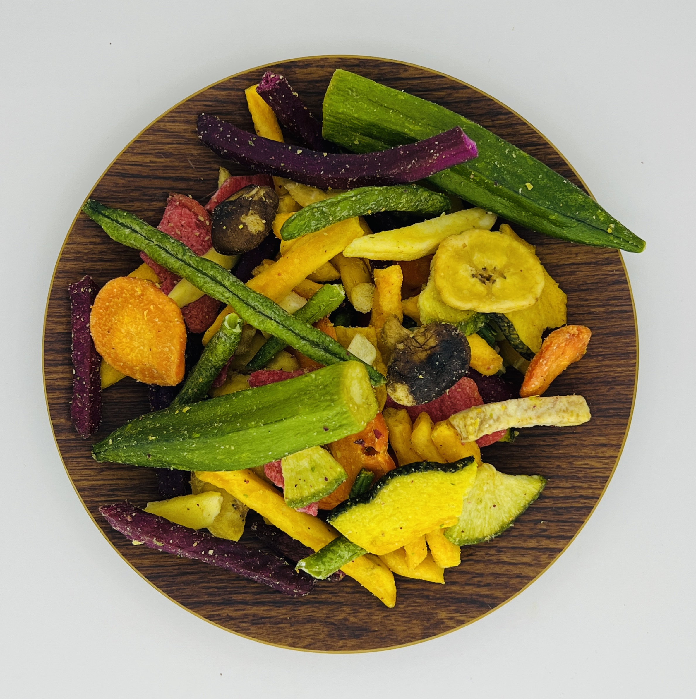 A healthy and crunchy snack made from: Green beans, zucchini, turnip, beetroot, potato, sweet potato, banana, carrot, okra, and mushroom.