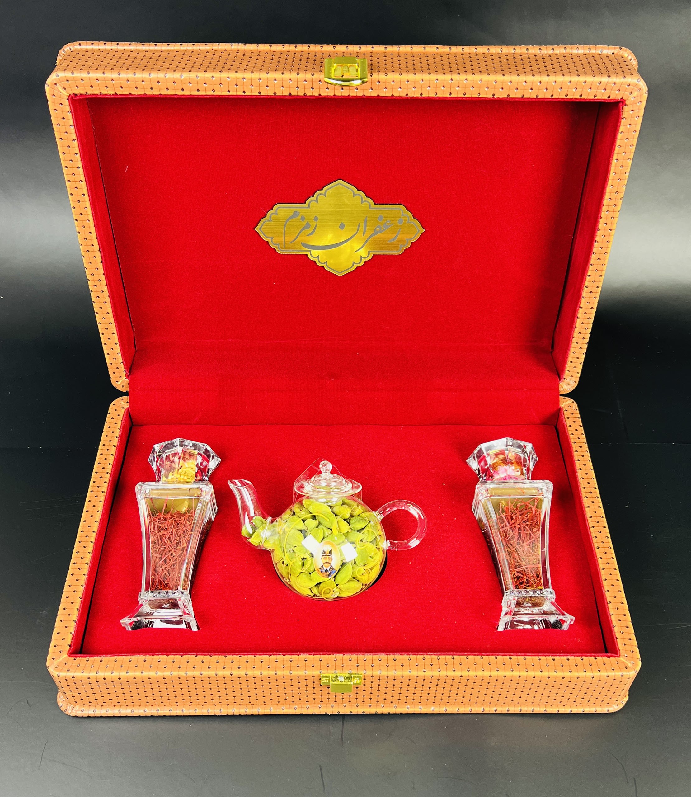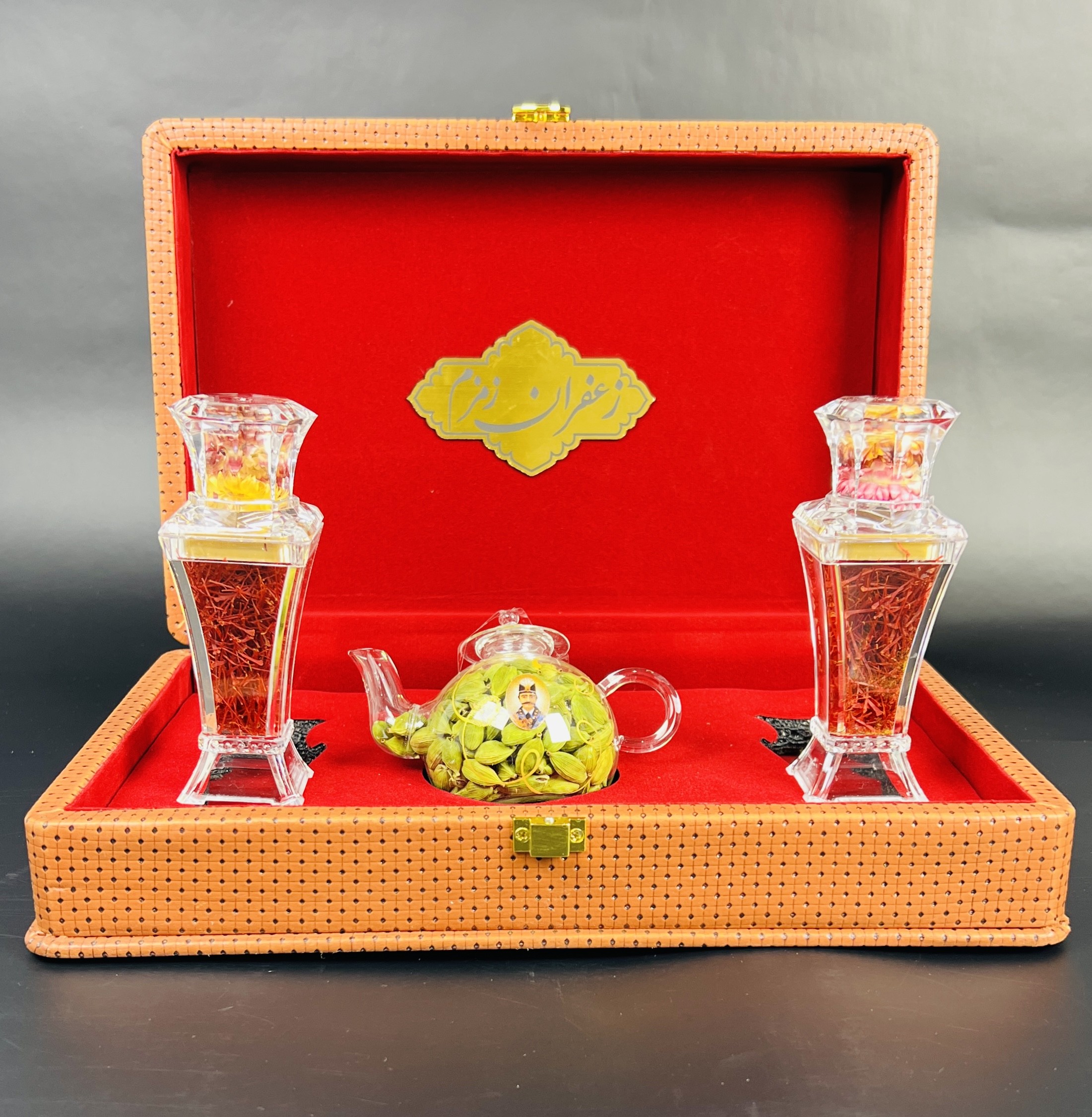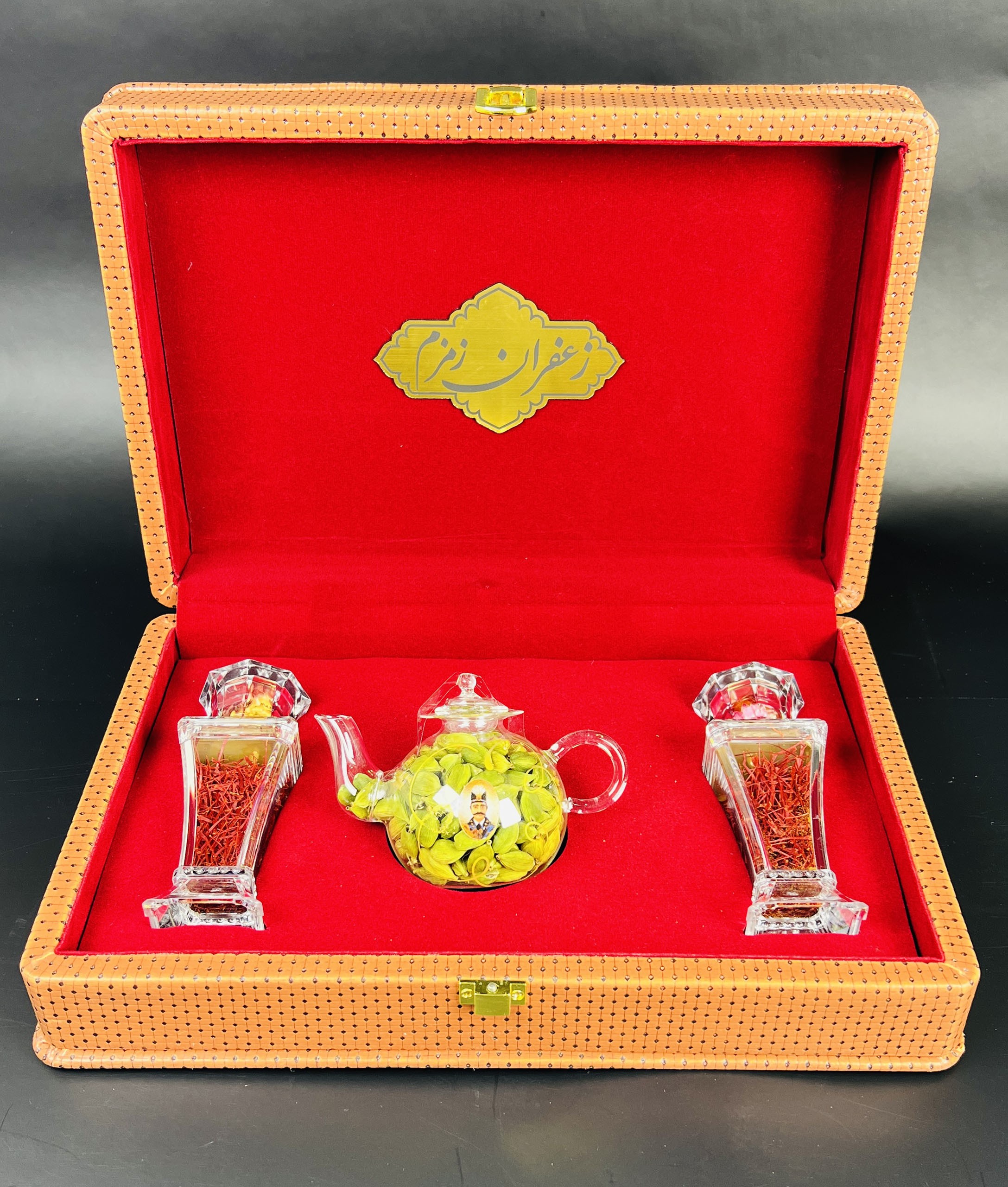 باكس جلدي أنيق يضم عبوتين برليان تحتويان على 3 غرام من الزعفران الإيراني الأصيل “سوبر نگين” مع هيل فاخر، مرتبة بجانب إبريق أنيق داخل صندوق جلدي جميل. خيار مميز وقيّم لتقديمه كهدية للأحبة.