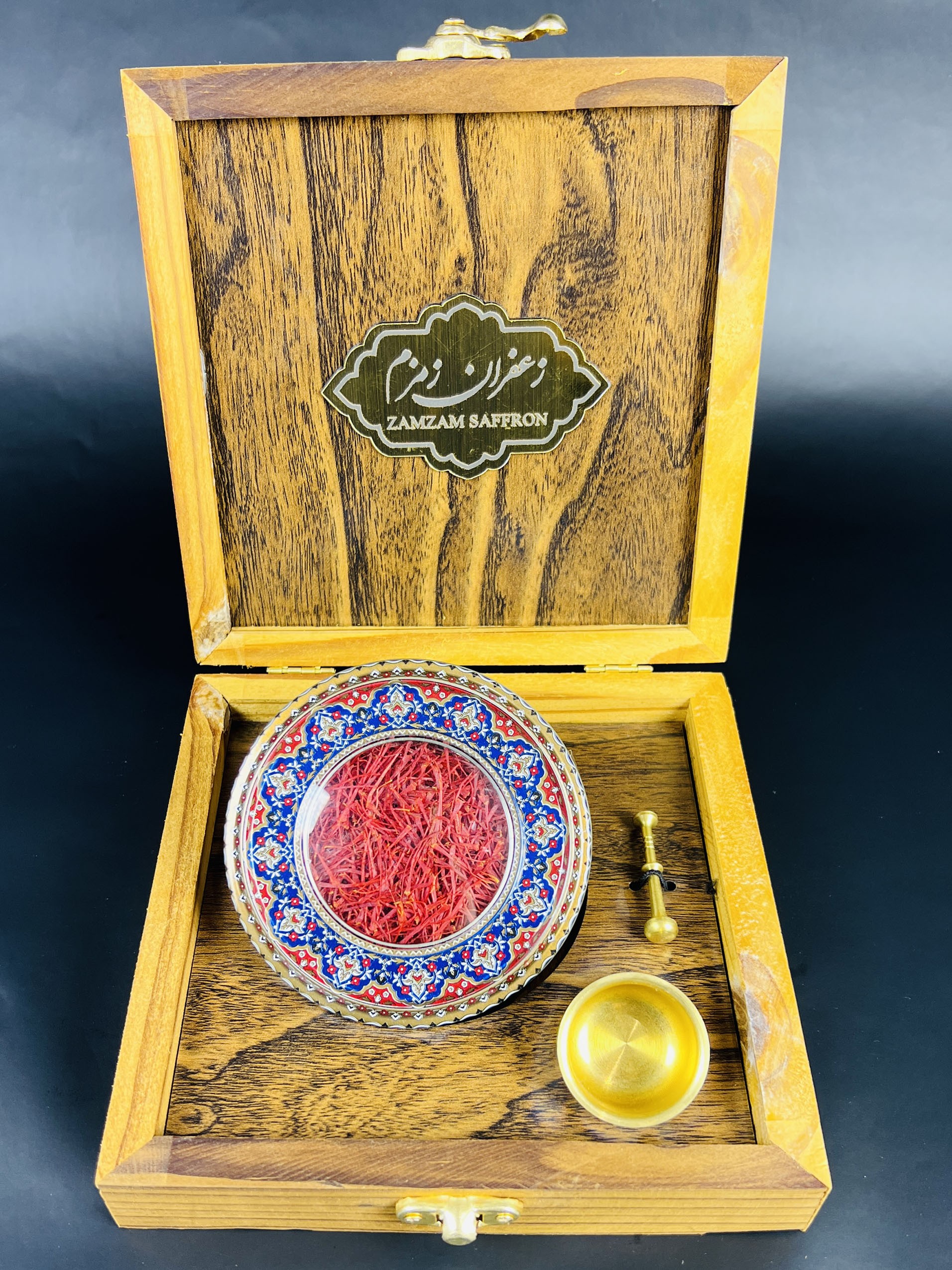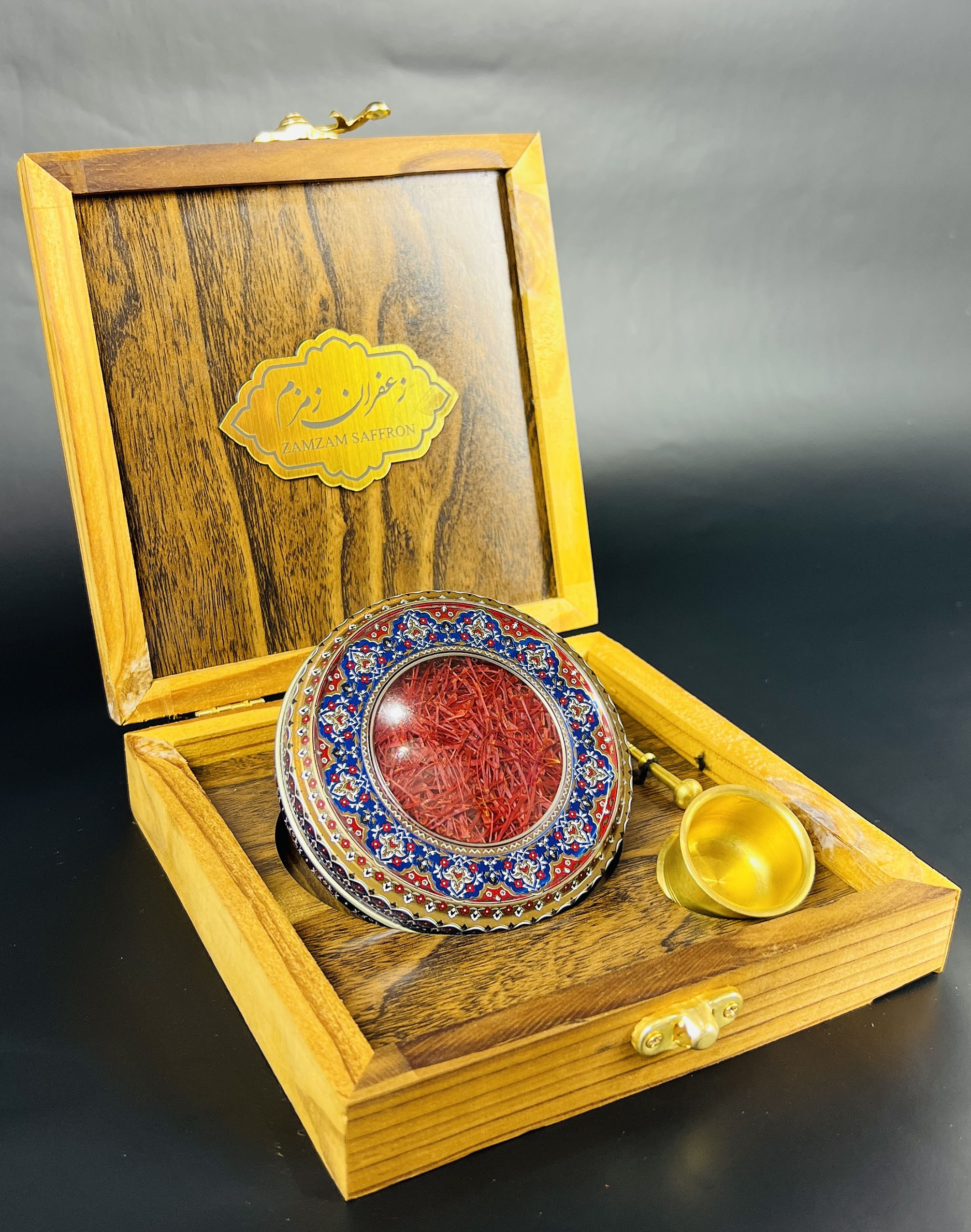 باكس هدية خشبي أنيق يضم 2 غرام من الزعفران الإيراني الأصيل “سوبر نگين” في علبة خاتم، مع هاون نحاسي، مرتبة داخل صندوق خشبي فاخر. خيار مميز وقيّم لتقديمه كهدية للأحبة.