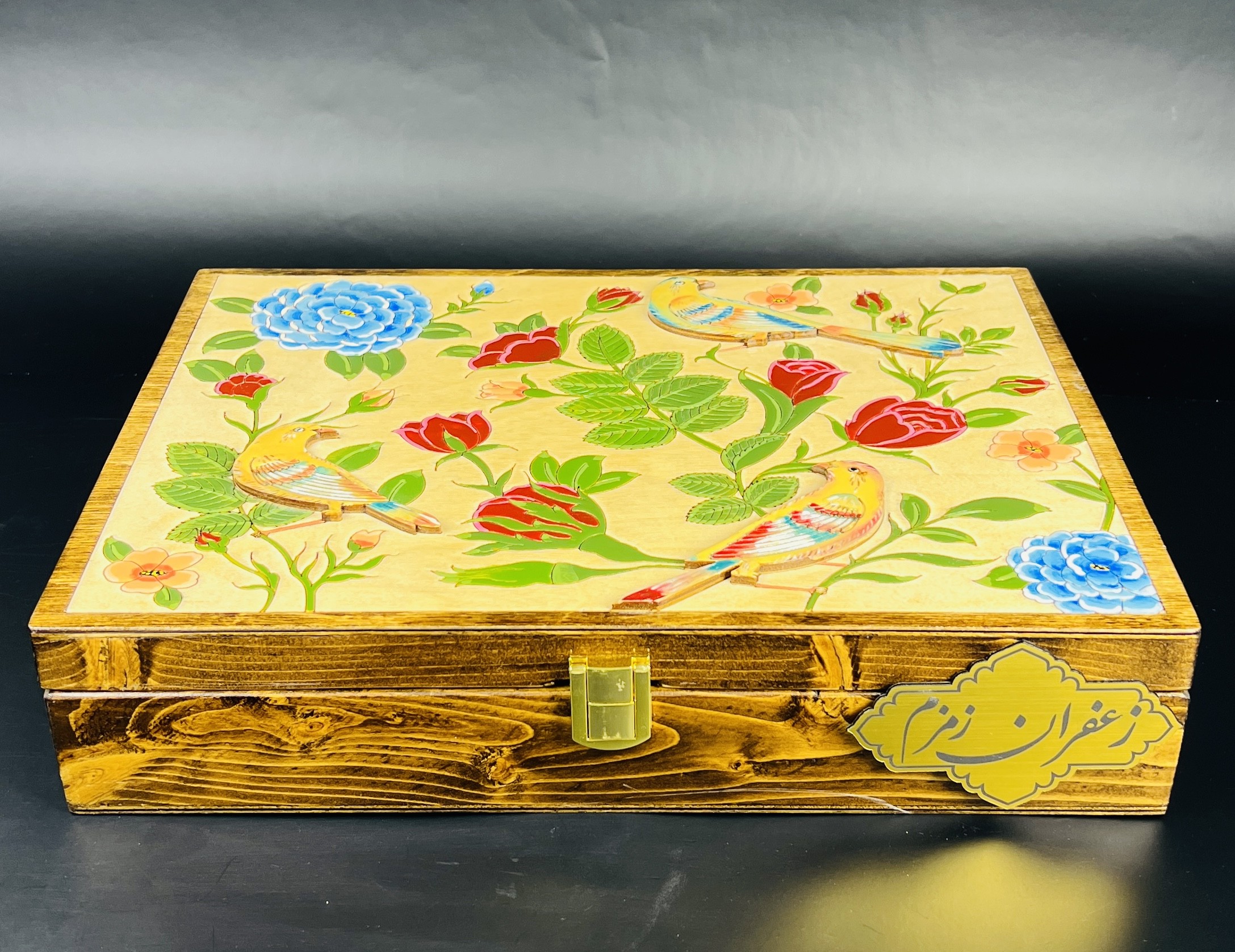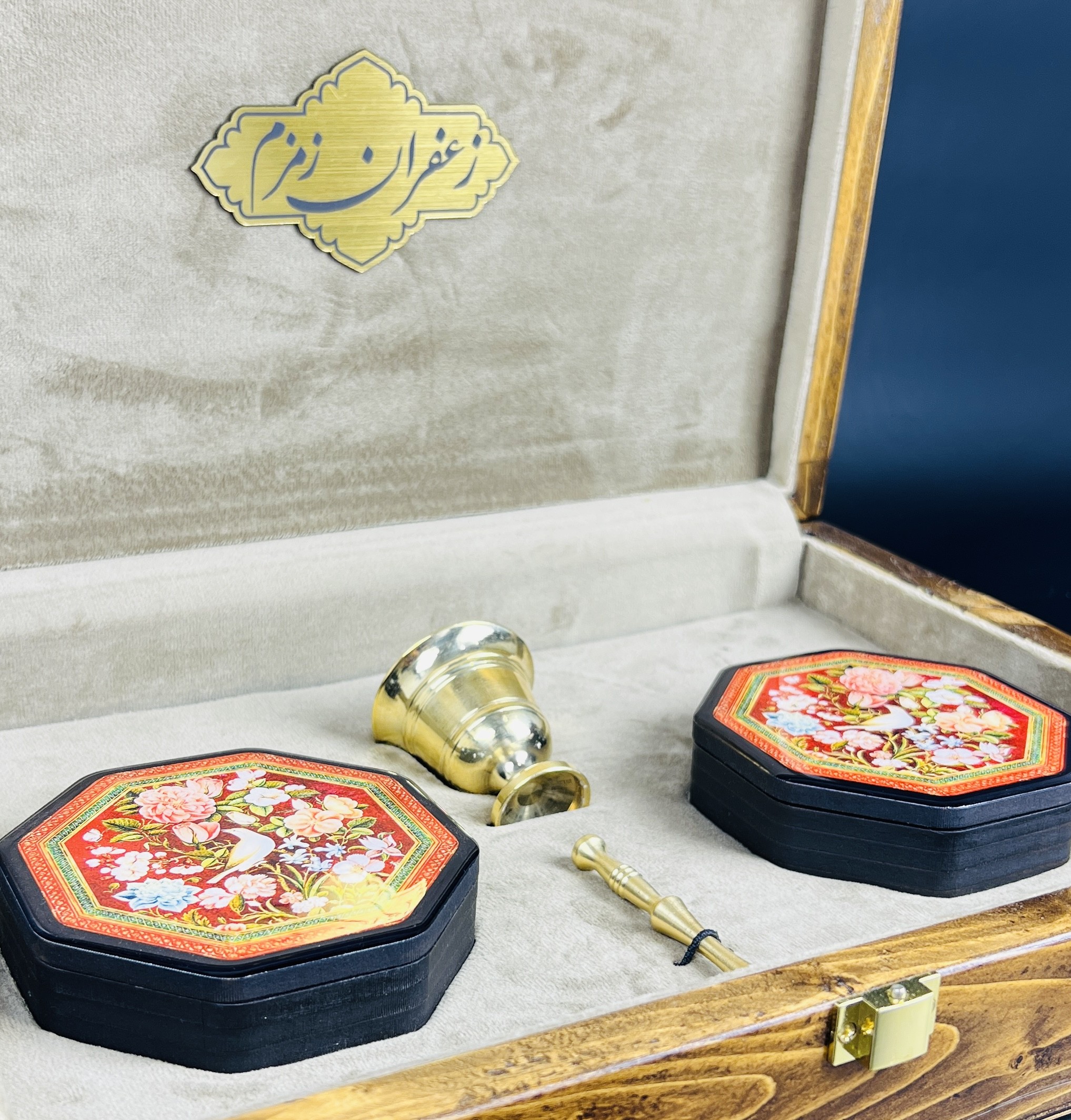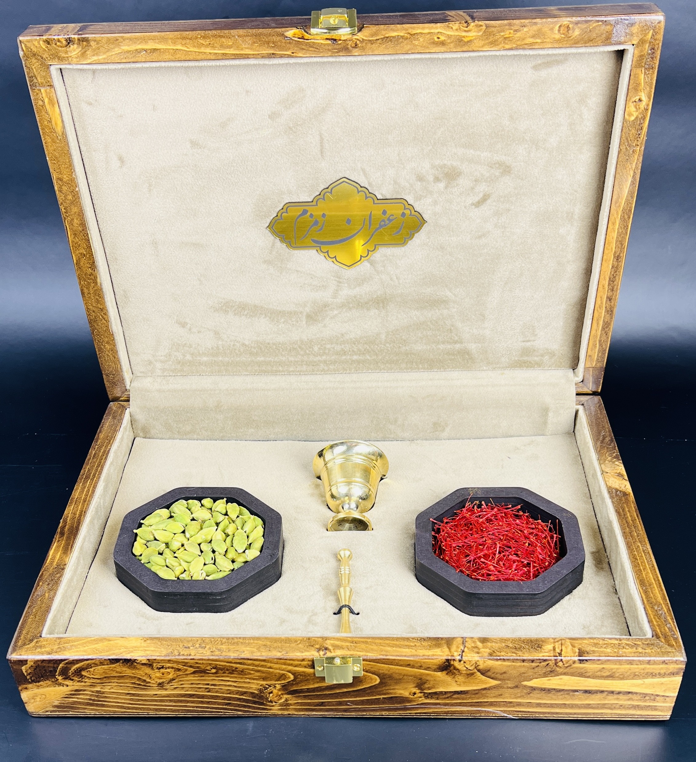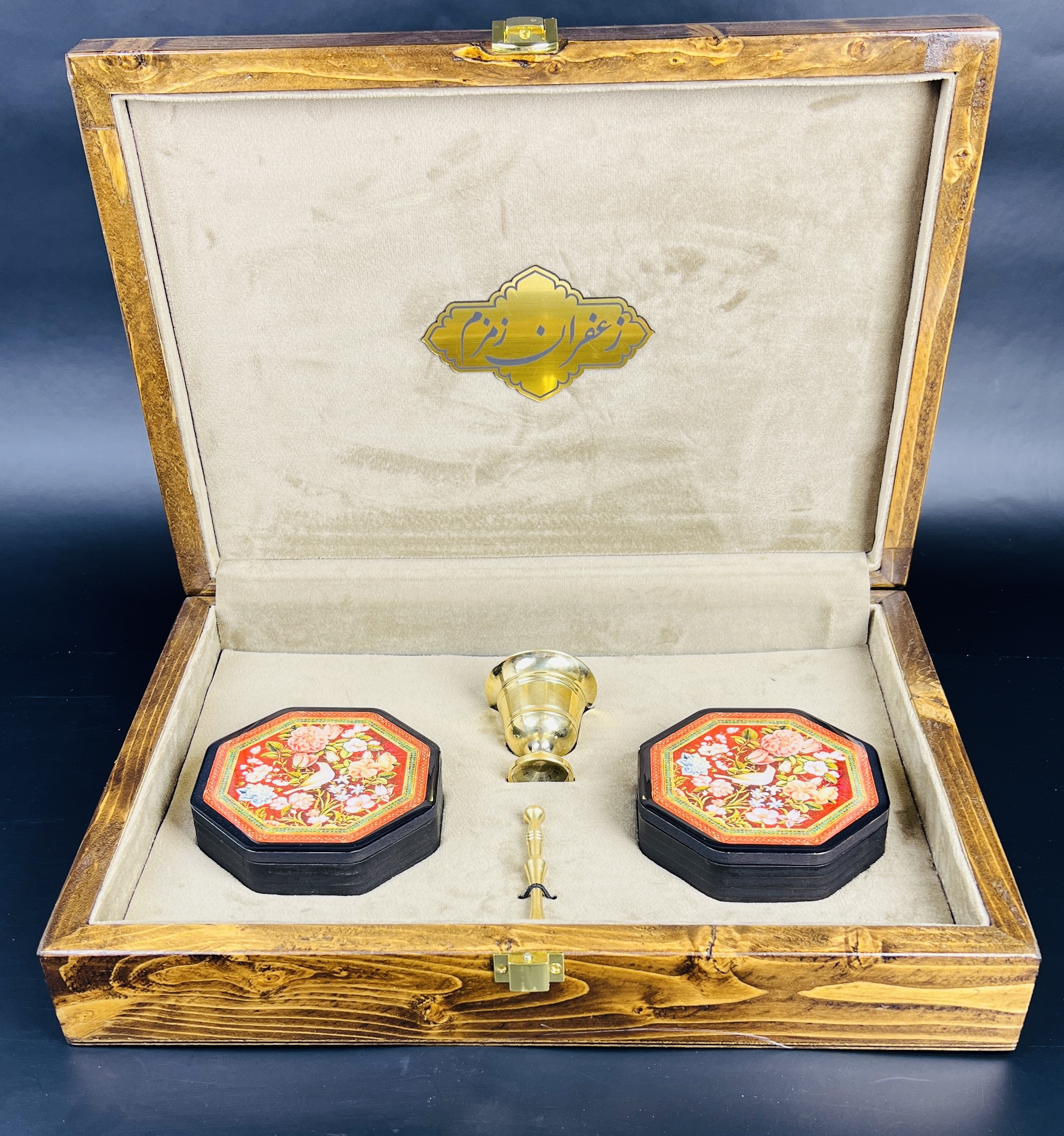 باكس هدية فاخر بتصميم گل وبلبل يضم 8 غرام من الزعفران الإيراني الأصيل “سوبر نگين”، مع هيل فاخر وهاون نحاسي، مرتبة داخل صندوق خشبي فاخر بتصميم تراثي جذاب. خيار مميز وقيّم لتقديمه كهدية للأحبة.