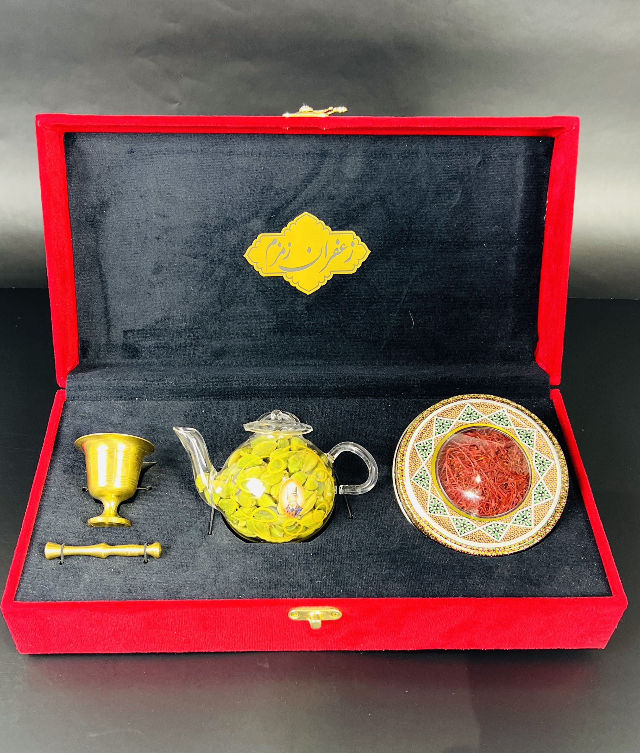 باكس هدية مخملي فاخر يضم علبة خاتم تحتوي على 2 غرام من الزعفران الإيراني الأصيل “سوبر نگين”، مع هيل فاخر وهاون نحاسي، مرتبة بجانب إبريق أنيق داخل صندوق مخملي جميل. خيار مميز وقيّم لتقديمه كهدية للأحبة.