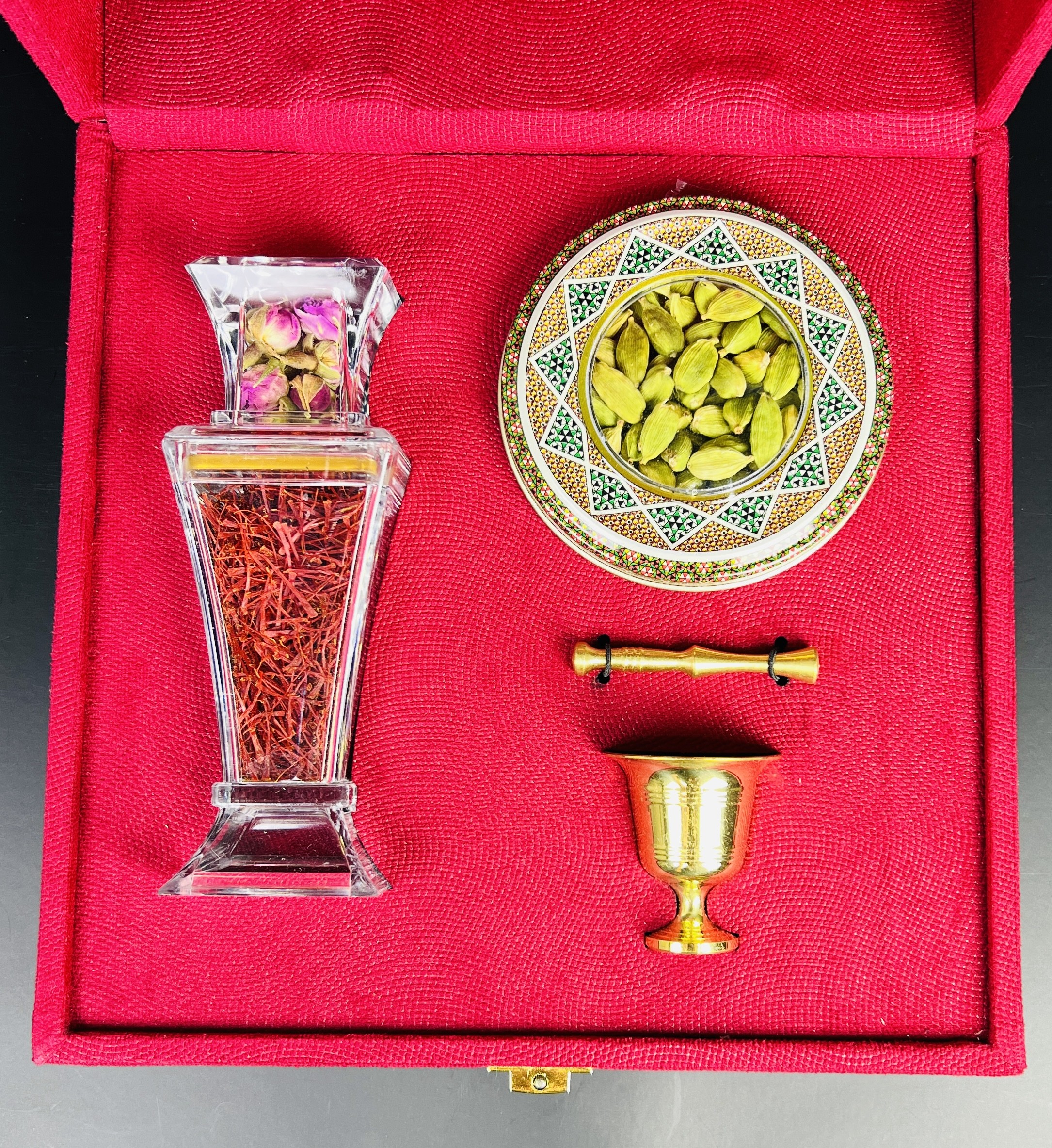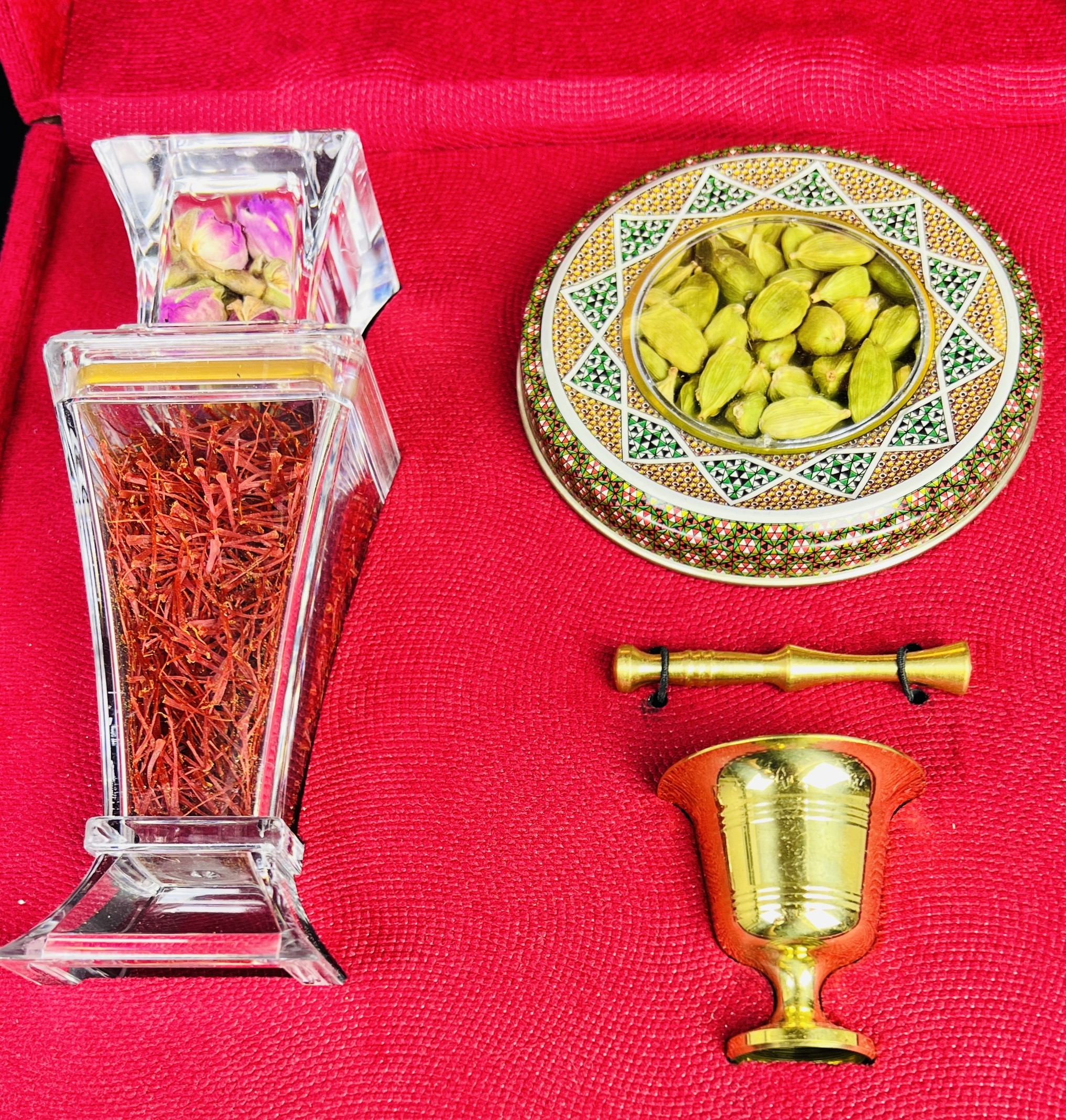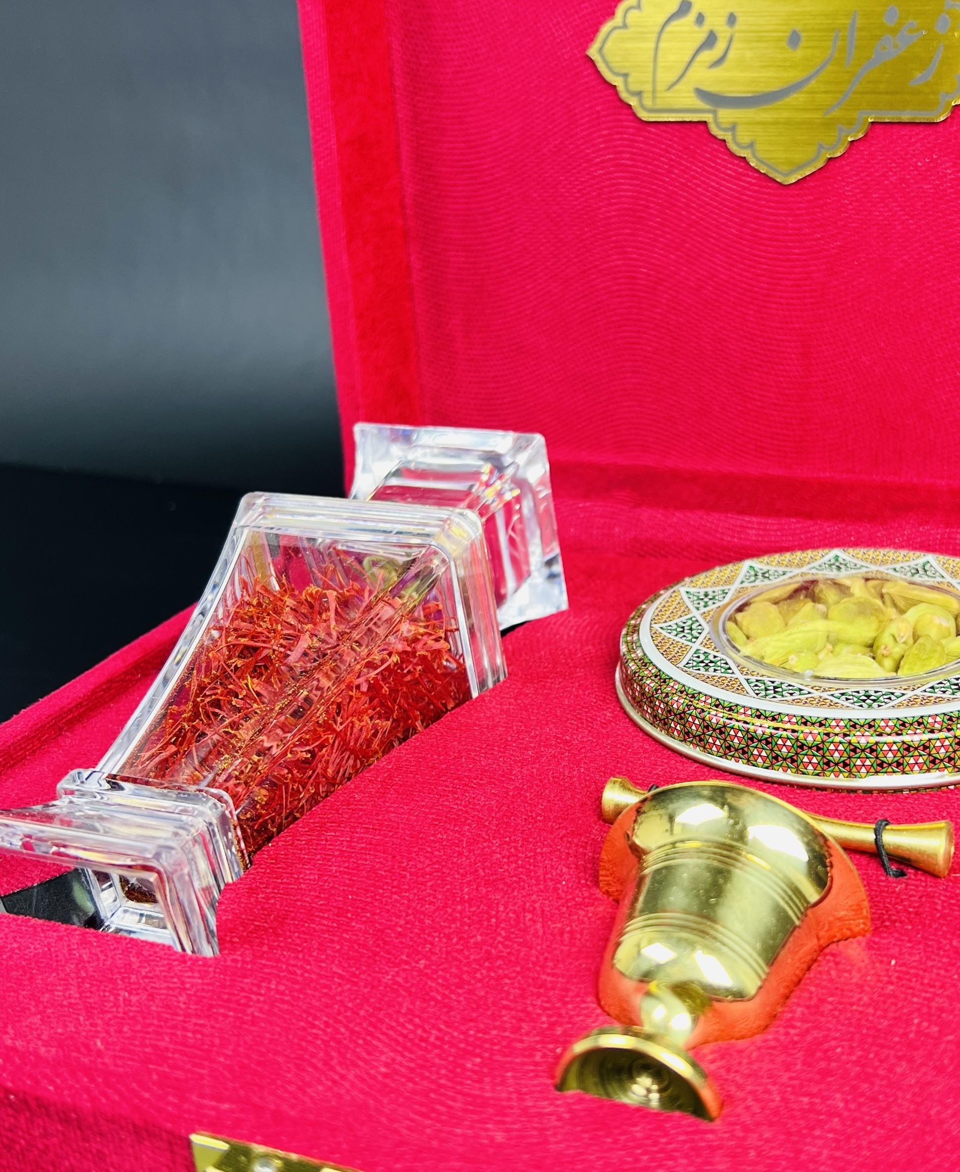 باكس مخملي فاخر «برليان» يحتوي على ٣٫٥ غرام من الزعفران الإيراني الأصيل “سوبر نگين” مع هاون نحاسي يدوي وهيل أخضر درجة أولى. هذا المزيج الفاخر يمنح مظهراً راقياً ويقدّم تجربة أصيلة ومميزة كخيار هدية فاخرة.